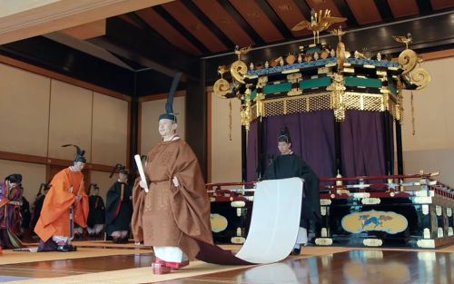 A sonido de gongs y de tambores, la ceremonia se llevó a cabo en la «sala de los Pinos» del palacio imperial, en presencia de la familia imperial, donde el primer ministro nipón, Shinzo Abe, dio un discurso de felicitaciones y después dirigió a la concurrencia a gritar tres veces «tenno heika banzai», que se traduce como «larga vida al emperador».