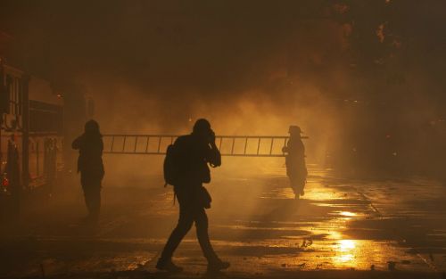 En los alrededores del palacio presidencial una nube de las barricadas en llamas se mezclaba en un clima de detonaciones de bombas de gases lacrimógenas, sirenas de bomberos, ruido de tanques lanza agua, piedras y palos de una batalla entre fuerzas del orden y manifestantes radicales que piden a gritos: «Renuncia Piñera».