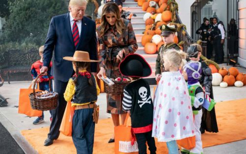 En la Casa Blanca se dispuso de un enorme cartel en la puerta que dice “Halloween”, y las escaleras laterales, con luces sombrías, estaban llenas de calabazas también iluminadas. Allí, durante el día, Donald y Melania repartieron con sus canastas chocolates Hershey’s.