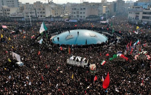 Después del rezo, se inició la procesión en la que el cuerpo de Soleimani fue trasladado a la plaza Azadi (Libertad), situada en el oeste de la capital, en la que participaron cientos de miles de personas. Para la cadena de televisión iraní Press TV fueron millones los ciudadanos presentes en la plaza Engelab (Revolución).