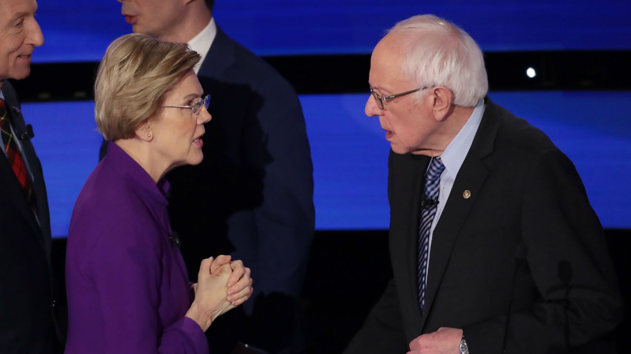 La disputa entre dos de los abanderados más progresistas de la campaña primaria se desarrolló en los momentos posteriores al final del debate, cuando la mayoría de los seis candidatos se dieron la mano cordialmente después del foro. En el escenario, Warren se negó a saludar a Sanders y lo encaró.
