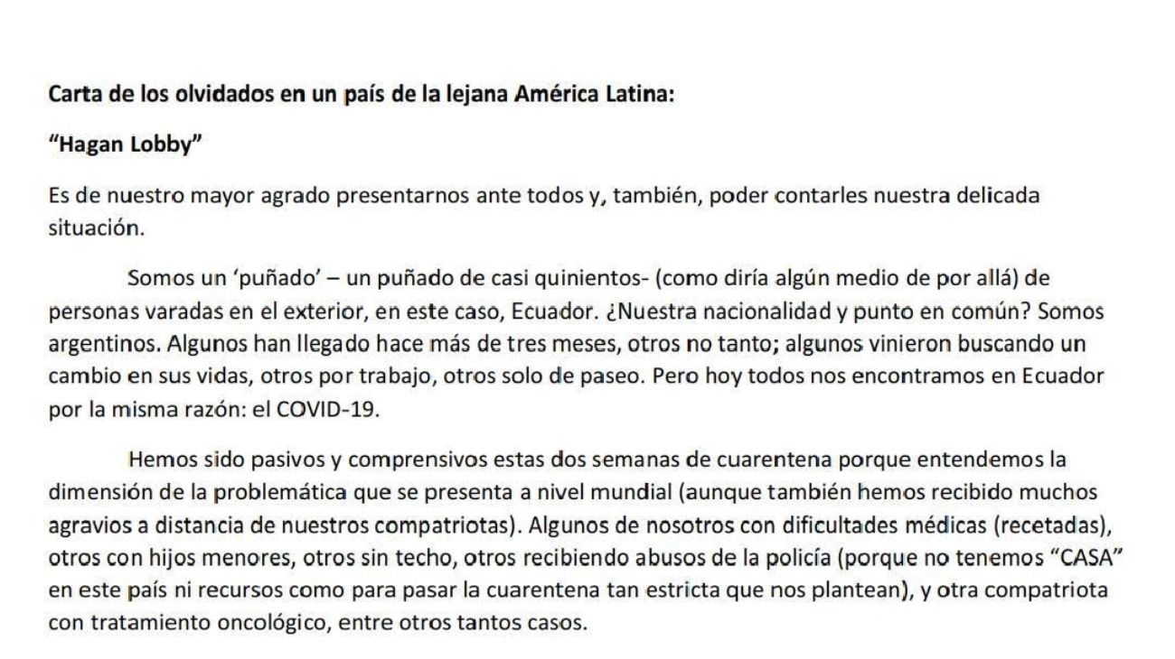 «Carta de los olvidados», el escrito de los argentinos varados en Ecuador