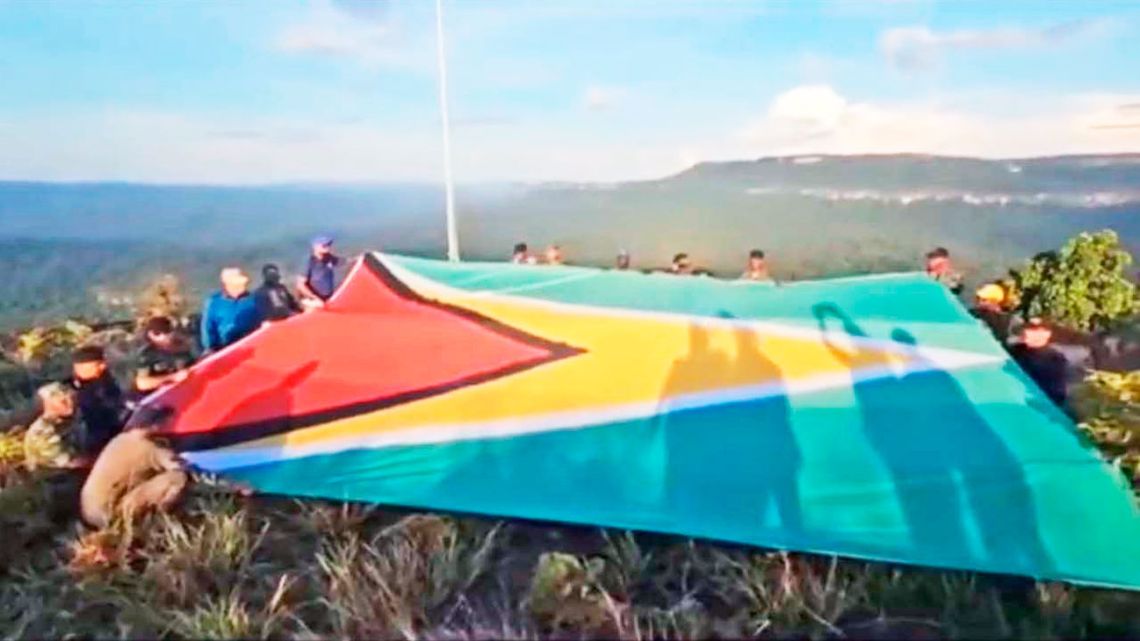 Una gigantesca bandera de Guyana ondea en territorio reclamado por Venezuela, izada ayer por militares guyaneses junto al presidente Irfaan Ali, en medio de denuncias de provocación desde Caracas. El jueves por la noche, Ali compartió con militares en el Esequibo, territorio de 160 mil kilómetros cuadrados rico en petróleo y recursos naturales, en el que Georgetown evalúa establecer bases militares con apoyo extranjero.