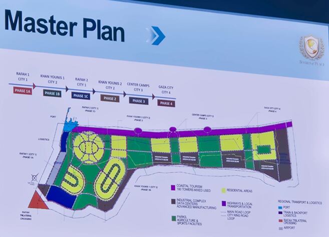 Una de las diapositivas muestra una nueva Rafah con avenidas arboladas y rotondas, más de 100.000 viviendas, 200 centros educativos, 180 instalaciones culturales y religiosas, y 75 centros médicos.
