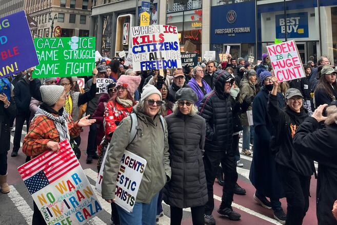 Personas participan en una manifestación en rechazo a los operativos del Servicio de Inmigración y Control de Aduanas (ICE) denominada «ICE Out For Good» este domingo, en Nueva York (Estados Unidos). Nora Quintanilla